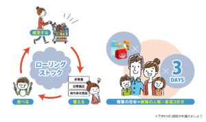 「ローリングストック」とは、日常食べ慣れている食品を少し多めにストックし、定期的に消費し、また買い足していくことで災害に備えようという方法です。