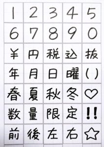 数字や記号、漢字を書く時も、これまでと同様に正方形をイメージして書いてください。